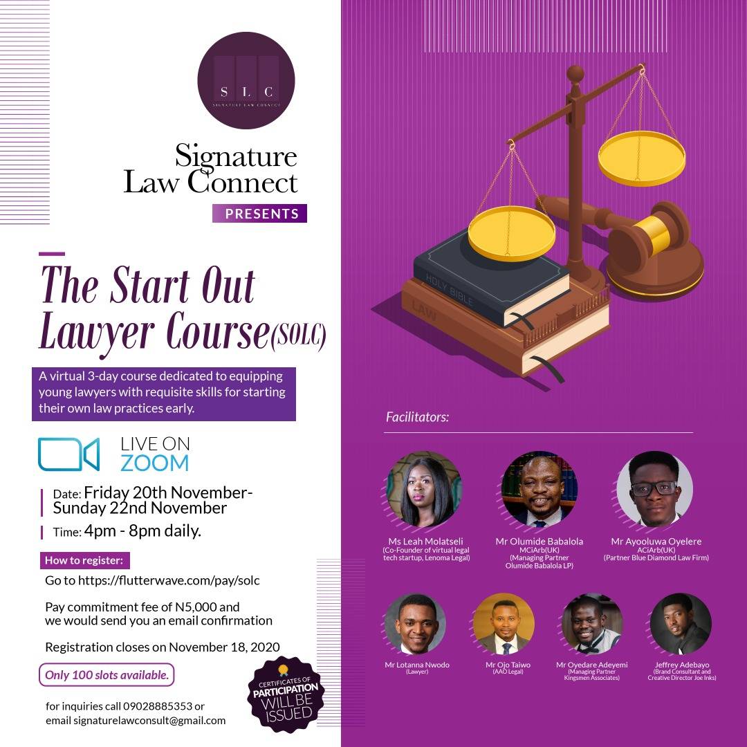 In this 3 day (12 hour) virtual course holding between 20th November and 22nd November 2020, the Start Out Lawyer Course, it is structured to give you the requisite knowledge and skill you need to take the bold leap to start your law firm early.